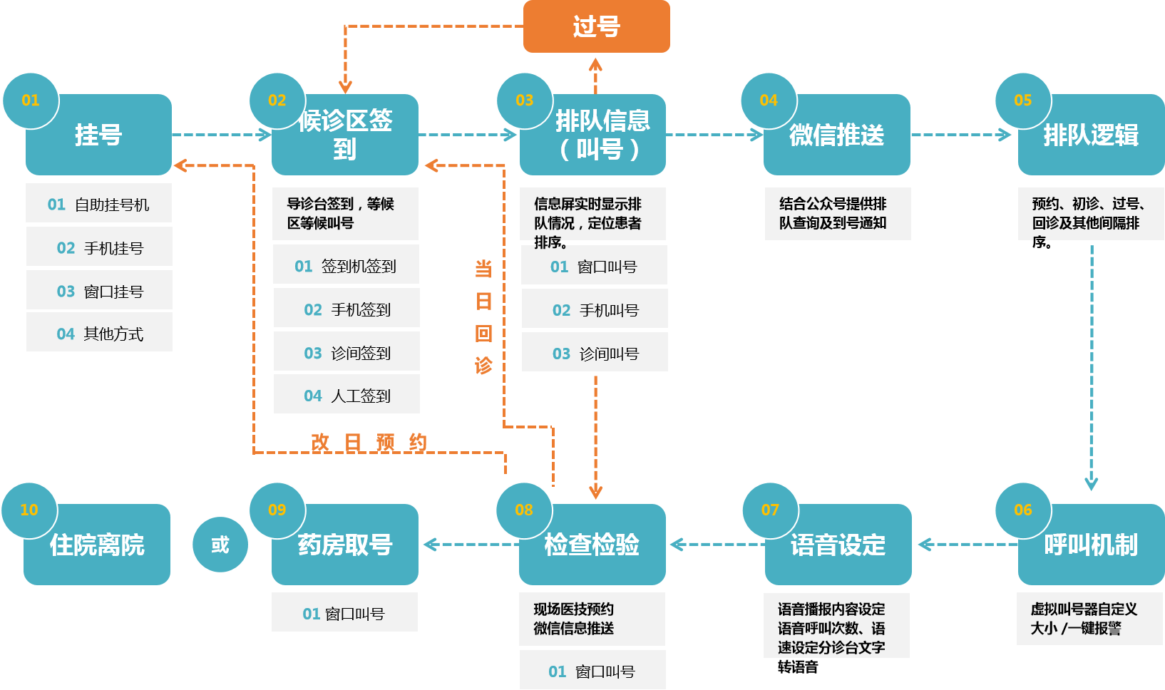 • 微信公众号/小程序:患者可在线完成导诊+挂号,减少现场排队。