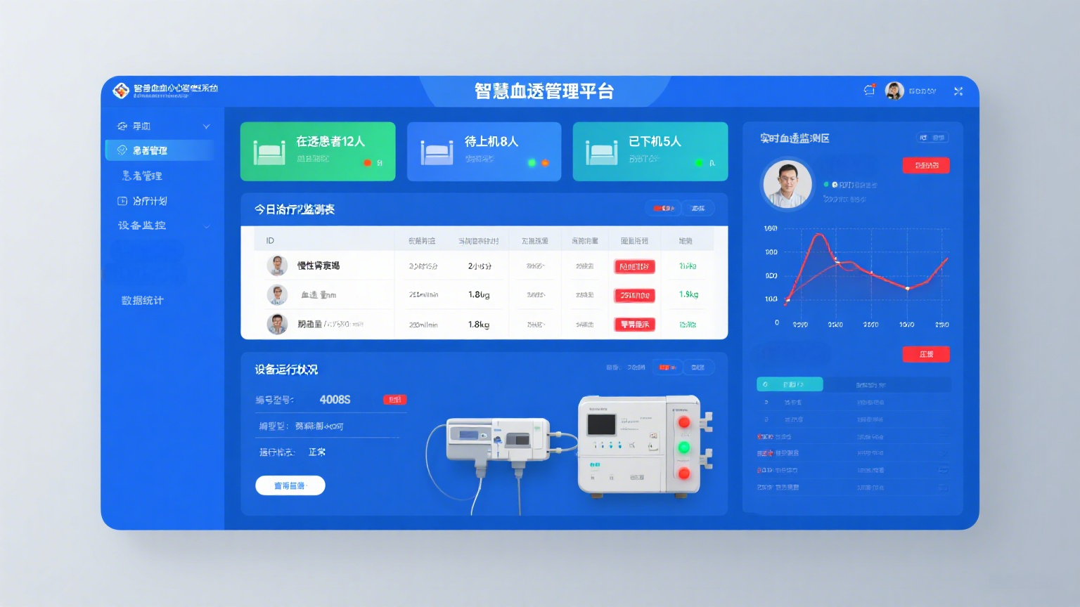 血透系统平台(血液透析智能管理系统)是基于物联网(IoT)、人工智能(AI)和大数据分析技术的医疗信息化解决方案,旨在优化血液透析治疗全流程管理,提升医疗质量、降低医护人员工作负担,并改善患者就医体验。该系统广泛应用于医院血液透析中心、肾内科及连锁透析机构,支持从预约、治疗到随访的全流程数字化管理